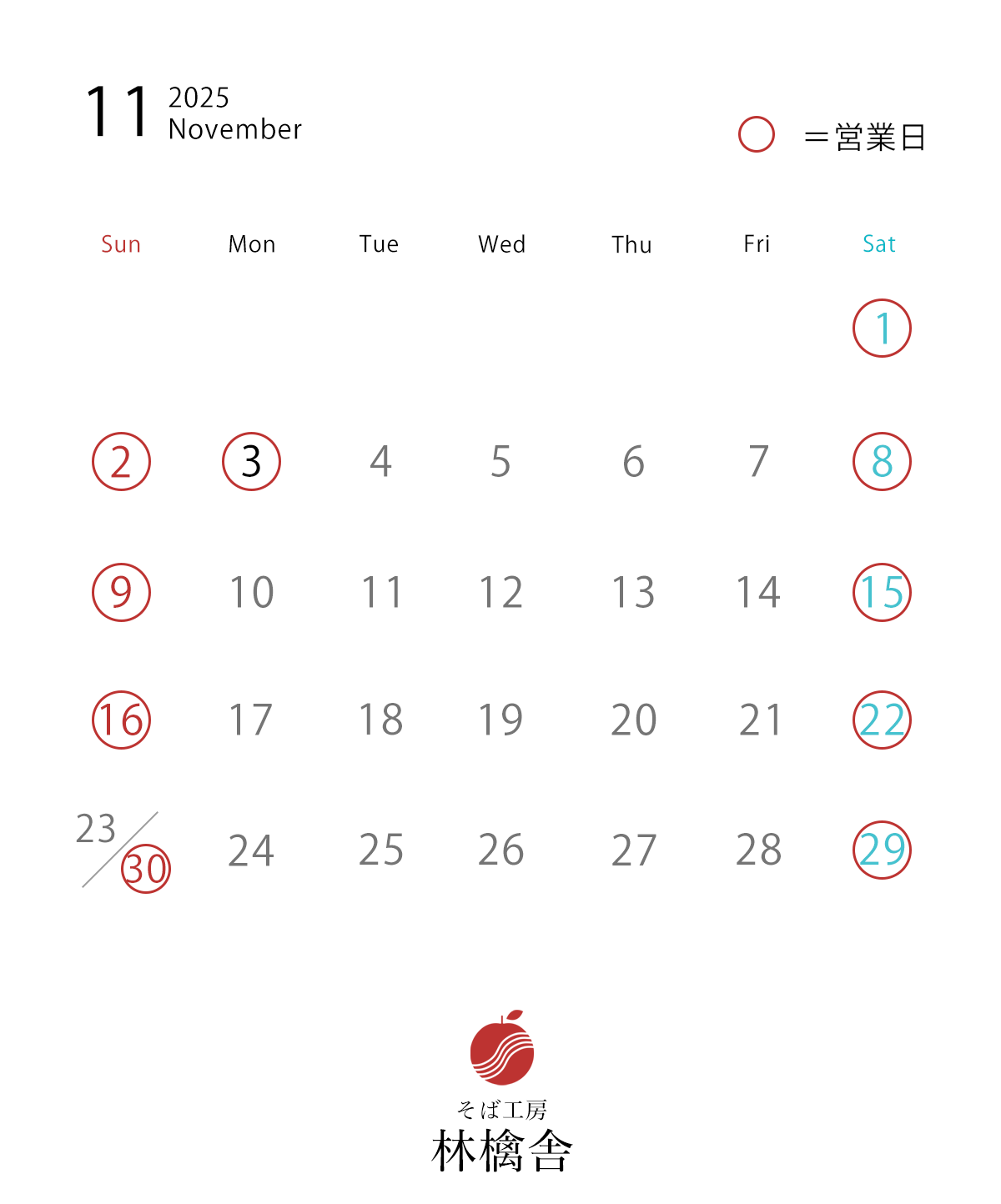 11月営業日のお知らせ